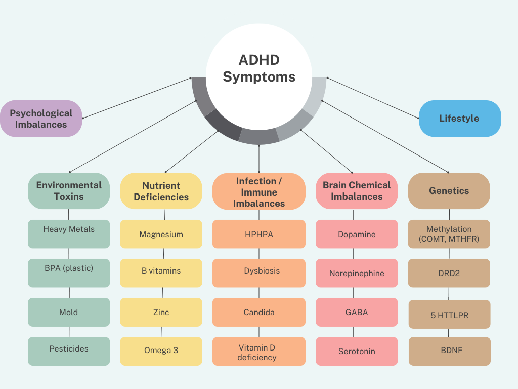 The cause of ADHD is complex and multi-factorial – everyone is unique. A holistic root-cause approach incorporating the latest science, research, and clinical expertise will consider the following: